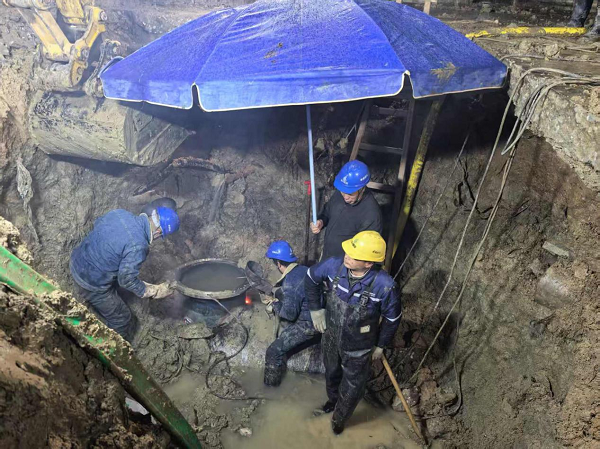 為將停水影響降至最低,運維部經(jīng)周密研判,果斷決定將施工窗口期設(shè)定在深夜。技術(shù)人員連夜開挖探查,根據(jù)管道破損實際情況精準(zhǔn)制定多套維修方案,最終克服技術(shù)難題,選定高難度的帶水作業(yè)方案,最大限度縮短停水時長。